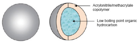 Product Shell composition Particle size (D80) T-start temp. °C T-max temp. °C Advantage TEP F019 Acrylonitrile co-polymers 10-50um 150-160 190-200 Anti-yellowing - Application
